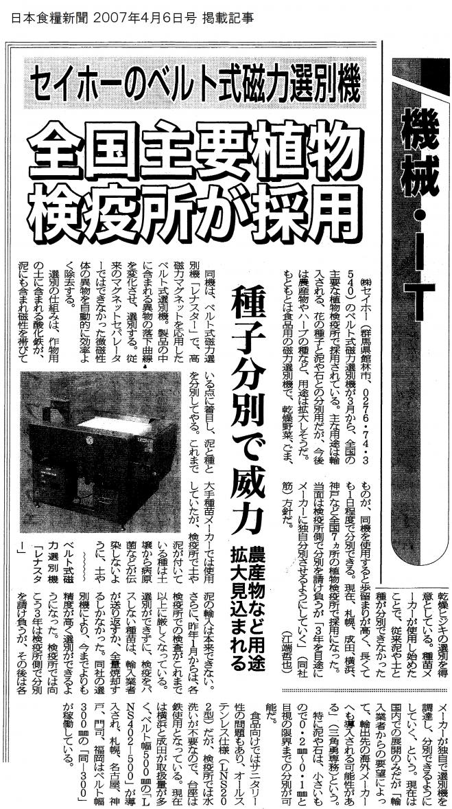 | 特長 | ◇ 鉄片、弱磁性体の異物、ステンレスの破断片、酸化鉄を含む石や泥・虫の糞等を選別除去 ◇ 高い歩留まりで異物除去 ◇ 小型コンパクト設計で少スペースに設置可能 ◇ シンプルな構造で取扱容易 ◇ ワンタッチでベルトの取外し取付けが可能 |