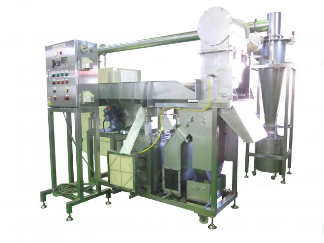 本機は振動モーターの定振幅動と特殊パンチングボードを使用し、高精度の形状選別をする振動選別機と、製品中の重量物・軽量物を3段で選別可能な風力選別機をコンバインド化し、製品中の様々な異物を効率良く除去する装置です。