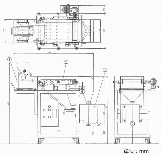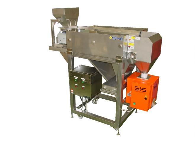 | 構成 | ① 投入ホッパー及び振動フィーダー 〈製品の定量均等供給〉 ② レナスター 〈鉄片、弱磁性体の異物、ステンレスの破断片、酸化鉄を含む石や泥・虫の糞等を選別除去〉 ③ SESOTEC社製RC型金属検出機 〈アルミ・銅・真鍮等非鉄金属の検知・除去〉 |