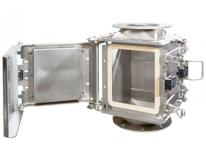 | 特長 | 2枚のプレートマグネットをステンレス製ケースの外側に向かい合うように設置し、ケース内の広範囲の磁場を発生させることで、より多くの磁性異物を捕捉します。 ケース内には遮蔽物が殆ど無い為、より多くの製品を流しながら、磁性異物除去が可能です。 マグネットはステンレス製のカバーが付いており、素早く簡単に清掃が可能です。 自由落下ラインへの取り付けはもちろん、空気搬送ラインにも取り付け可能です。 |