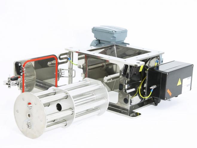 | 特長 | 油分を含む粉末や、積層しやすい粉末、電子部品材料などの、一般的な格子マグネットでは閉塞、滞留、蓄積しやすい製品に適しています。 二重管構造となっており、清掃が容易で、洗浄のバラつきがありません。 食品分野にも対応します(HACCP) フランジは角型・丸型以外にもご用意できます。 |