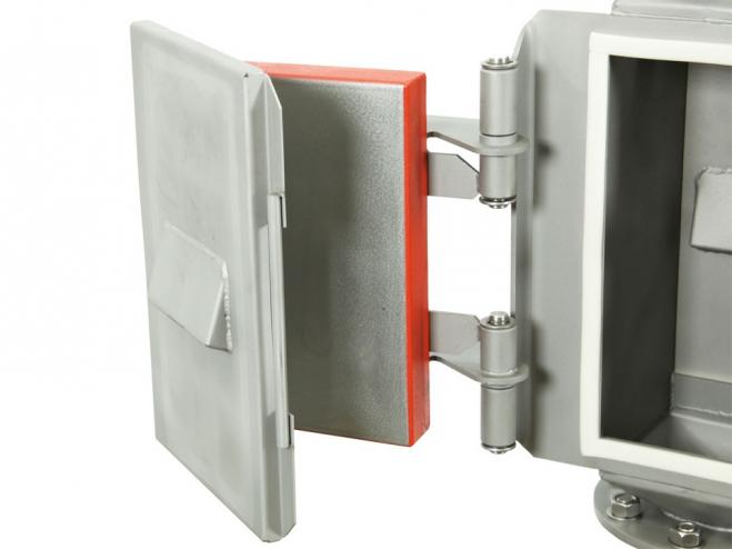 | 特長 | 2枚のプレートマグネットをステンレス製ケースの外側に向かい合うように設置し、ケース内の広範囲の磁場を発生させることで、より多くの磁性異物を捕捉します。 ケース内には遮蔽物が殆ど無い為、より多くの製品を流しながら、磁性異物除去が可能です。 マグネットはステンレス製のカバーが付いており、素早く簡単に清掃が可能です。 自由落下ラインへの取り付けはもちろん、空気搬送ラインにも取り付け可能です。 |